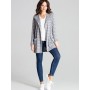 Pull gris en maille longue avec des rayures horizontales décoratives et une capuche. Grandes poches plaquées à l'avant, sans fermeture.