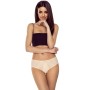 Culotte féminine exceptionnellement élégante et confortable, idéale pour toutes les silhouettes. La combinaison de la maille et de la dentelle a permis de créer un modèle que toutes les femmes apprécieront. La ceinture est élastiquée et douce, avec un aspect satiné. Le devant est en microfibre et en dentelle dans la partie centrale, tandis que les côtés sont en maille extensible qui rappelle la structure d'un cabaret. L'ensemble est doublé à l'intérieur d'une maille délicate camouflage. Complété par un nœud décoratif avec un élément décoratif doré. Dos dans la partie supérieure en dentelle avec une découpe spectaculaire et un anneau doré reliant la ligne élastique à la taille. La ligne des fesses est constituée d'une double couche de maille cabaret, sans coutu