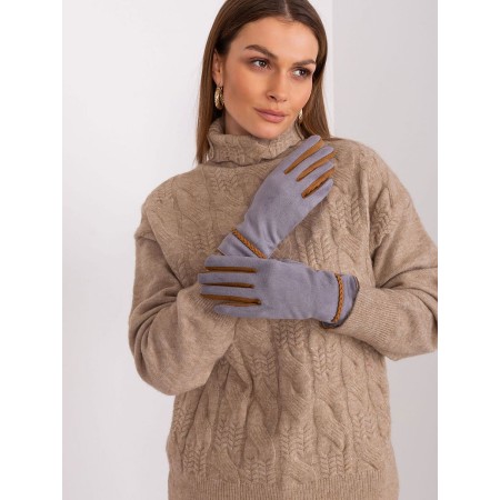 Élégants gants de femme en tissu lisse avec empiècements contrastés entre les doigts. Bretelles décoratives tressées contrastées aux poignets. Pouce et index avec fleur brodée, permettant d'utiliser le téléphone sans enlever les gants.