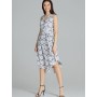 Robe midi légère et aérée, sans manches et à motifs. Encolure enveloppante, surpiquée à la taille d'une ceinture à nouer décorative. La robe a un bas évasé et asymétrique. Fermeture éclair couverte sur le côté gauche.