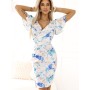 Émerveillez-vous de la délicatesse et de la féminité! Cette élégante robe à motif floral est une proposition idéale pour le printemps et l'été. L'encolure cache-coeur sensuelle met subtilement en valeur la poitrine, tandis que les volants délicats aux manches ajoutent de la légèreté à toute la tenue. La coupe ajustée met magnifiquement en valeur la silhouette féminine, et la ceinture nouée permet un ajustement parfait à la taille. Le motif dans les tons de bleu, de lavande et d'écru rend la robe romantique, fraîche et incroyablement à la mode. Elle conviendra parfaitement aux événements familiaux, aux baptêmes, aux communions, aux rendez-vous et aux rencontres élégantes. Fabriquée dans un matériau confortable et élastique, elle assure un confort de port et un