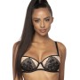 Soutien-gorge push-up élégant en noir et beige. Les bonnets, l'entre-bonnet et le dos sont recouverts de maille beige, finis avec un liseré noir. Les bonnets sont ornés de dentelle, avec des coussinets amovibles entre les bonnets et un nœud. Pas d'armatures verticales latérales. Bretelles réglables non amovibles. Dos en maille, fermé à l'arrière par des crochets. Fermeture à double rangée avec ajustement sur trois niveaux.